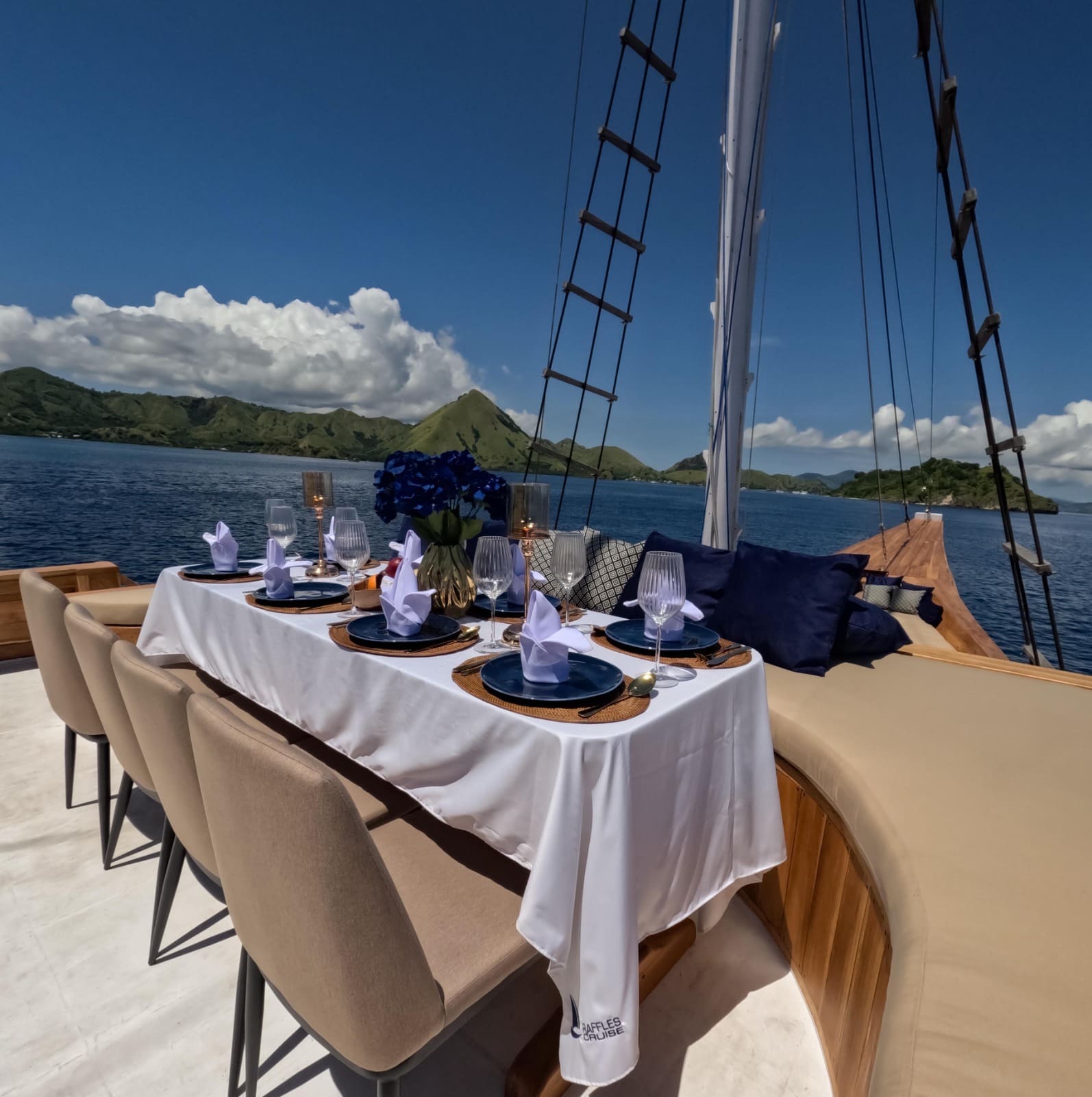 Raffles cruise was built in 2023 in South Sulawesi. It was operated in April 2025. Raffles is modern-classic built, phinisi vessel available for private charter or sharing trips through the incredible waters and scenery of Indonesian archipelago. Designed with an emphasis an space, privacy and comfort, Raffles has 6 generous cabins spread across 2 decks all is ocean view cabins, an intimate and cozy lounge and dining room. There are plenty of lounge areas for everyone to enjoy.